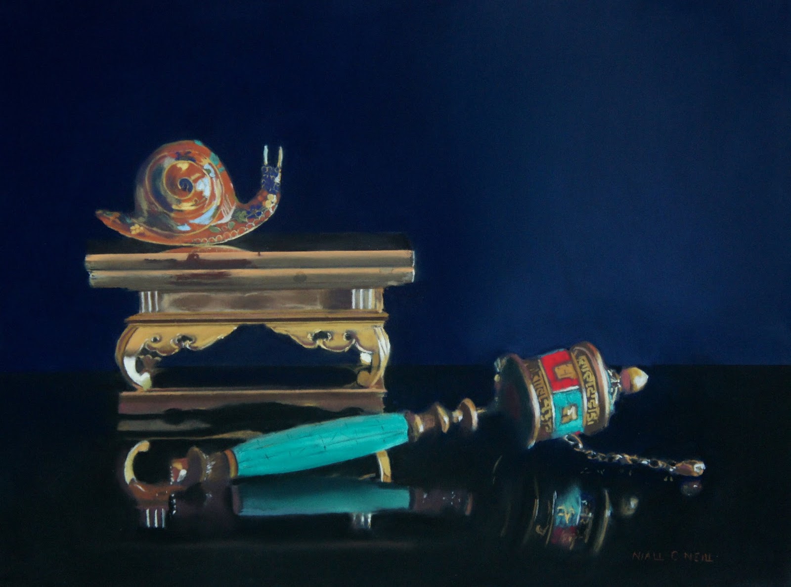 CarbOthello pencil 545 gave a sharp edge where needed. The red was Sennelier 266 and CarbOthello 325, an excellent match. Rembrandt gold ochres and further CarbOthello pencils were used to detail the snail and prayerwheel.